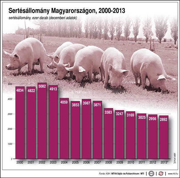 A sertések száma 2 millió 892 ezer volt június elsején, a decemberi állománynál 64 ezerrel, az egy évvel korábbinál 20 ezerrel lett kevesebb. A sertések száma tíz éve még meghaladta az 5 milliót, 2012 júniusa óta azonban 3 millió alatti - közölte a KSH. Az anyakocák száma (194 ezer) egy év alatt 11 ezerrel csökkent.