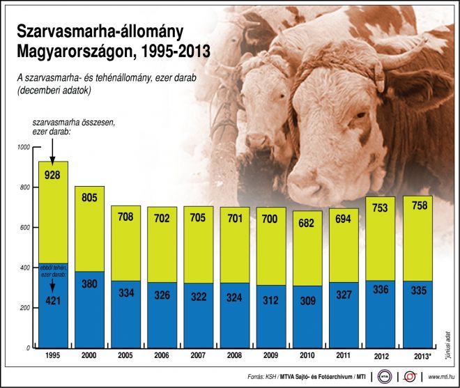 A szarvasmarhák száma idén június elsején 758 ezer volt, az állomány egy év alatt 25 ezerrel, a tavaly decemberi összeírás óta 5 ezerrel nőtt. A tehénállomány egy év alatt nem változott, június elsején 335 ezer egyedet tartottak nyilván, a számuk 2003 júniusa óta 27 ezerrel (7 százalékkal) csökkent.